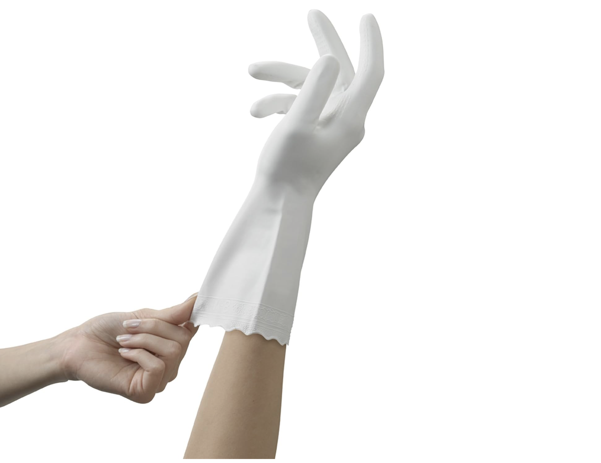 My two favorite brands of cleaning gloves are Mr. Clean Bliss Premium Latex-Free Gloves or Soft Scrub Premium Comfort Latex Free. Both are lined with pillow soft and ultra absorbent cotton, with raised pattern non-slip grip for better grip in wet and dry conditions. Also, these gloves do not contain latex, BPA or Phthalates - hey, works for me! They coddle my hands while providing a protective barrier and allow for efficient house cleaning. They might not be as lasting as your typical, heavy duty, super stiff cleaning gloves but will certainly yield enough mileage as to make the price worthwhile.